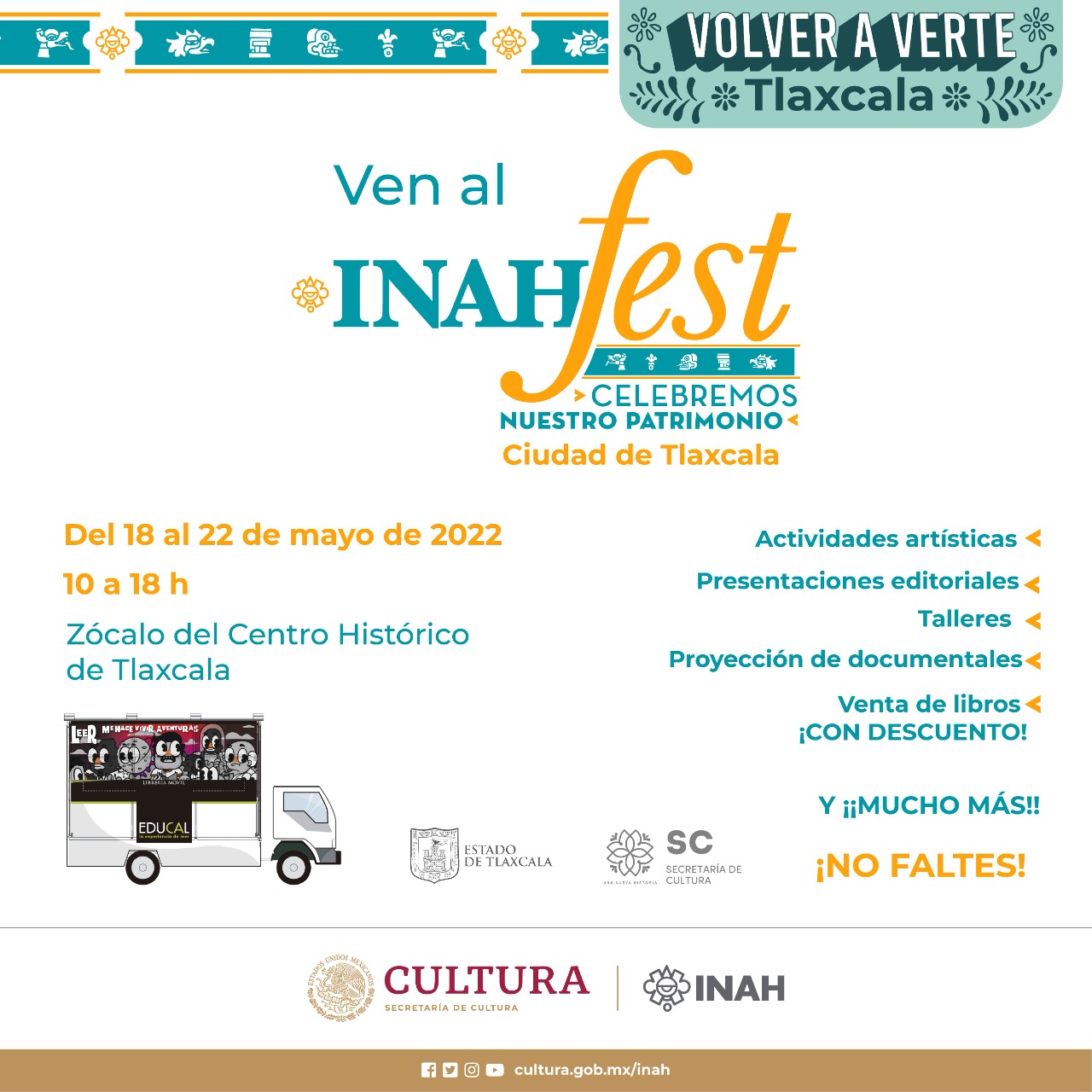 Con el interés de contribuir a la reactivación de los espacios culturales, luego de poco más de dos años del confinamiento por pandemia, la campaña “Volver a verte” de la Coordinación de Difusión del INAH, traerá a Tlaxcala presentaciones artísticas, exposiciones gráficas y fotográficas además de documentales y producción editorial con el librobús, del EDUCAL.