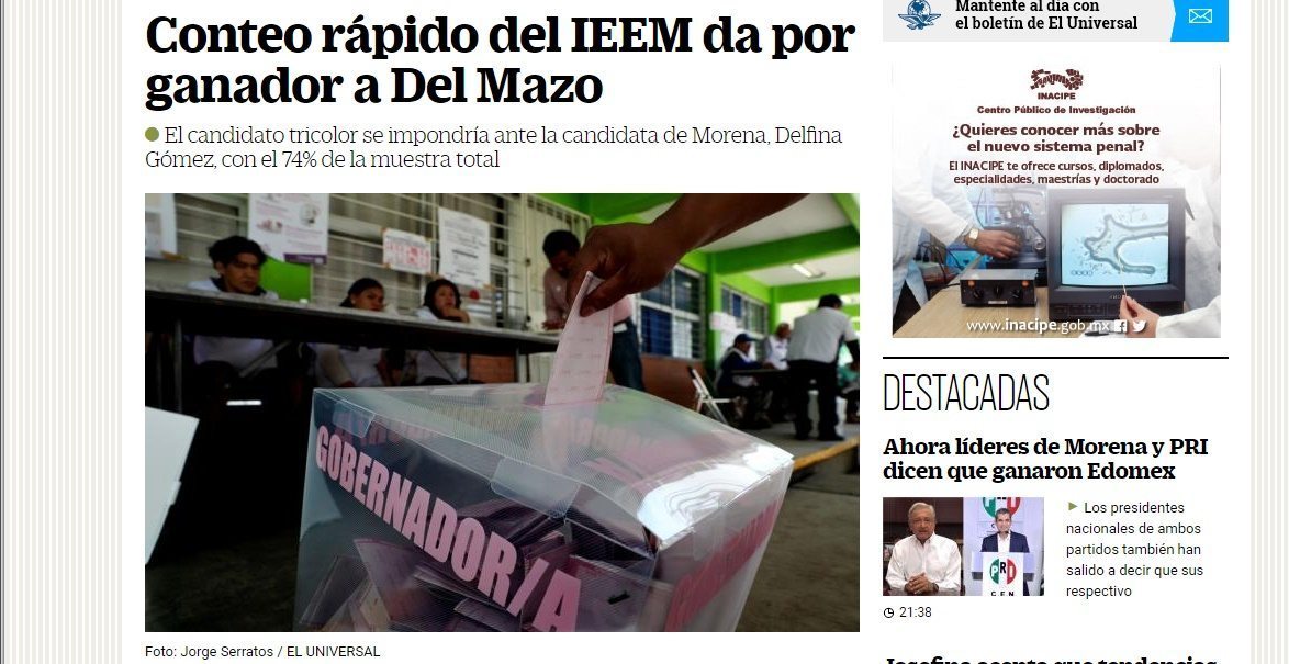 El Instituto Electoral del Estado de México (IEEM) congeló el Programa de Resultados Preliminares (PREP) de la elección de gobernador cuando se habían contabilizado 4,631 (25%) del total de 18,606 actas de la votación; y sin embargo, anunció una victoria de Alfredo del Mazo en base a un conteo rápido (quick count) soportado en la sumatoria de solamente 1347 actas, ello a pesar de que la ventaja del presunto ganador sobre la perseguidora Delfina Gómez ronda los 2 puntos porcentuales.