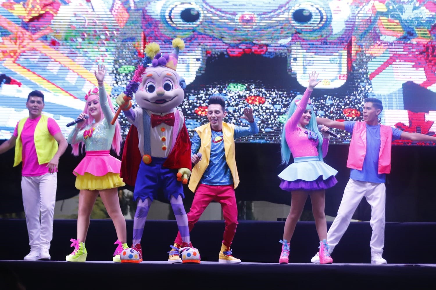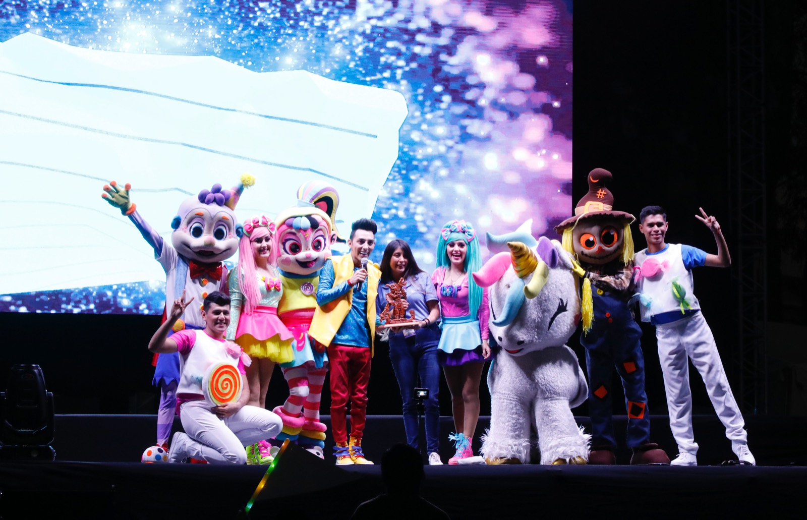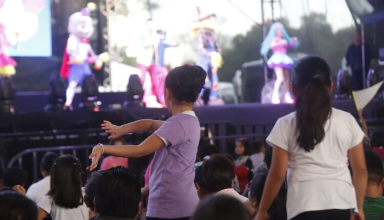 Al escenario también subieron Pumpe, un personaje al que le encantan los cumpleaños; Vanila, una niña que come muchos dulces y no le gusta bañarse; así como el monstruo de los zapatos, el espantapájaros y el unicornio mágico, que pusieron a bailar a las y los menores que irradiaban felicidad en sus rostros.