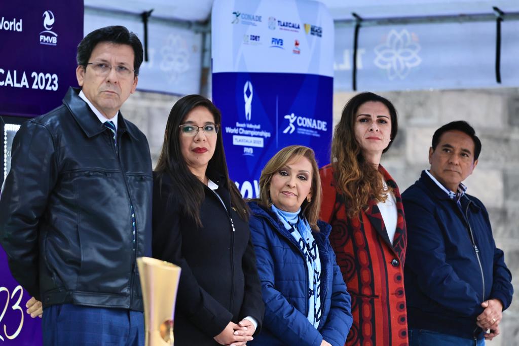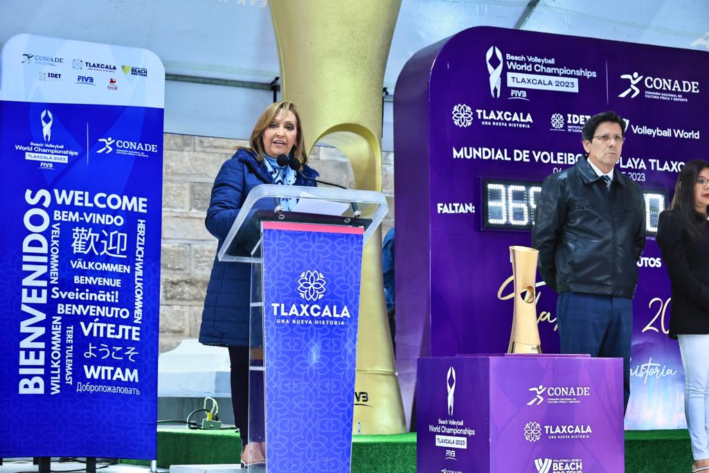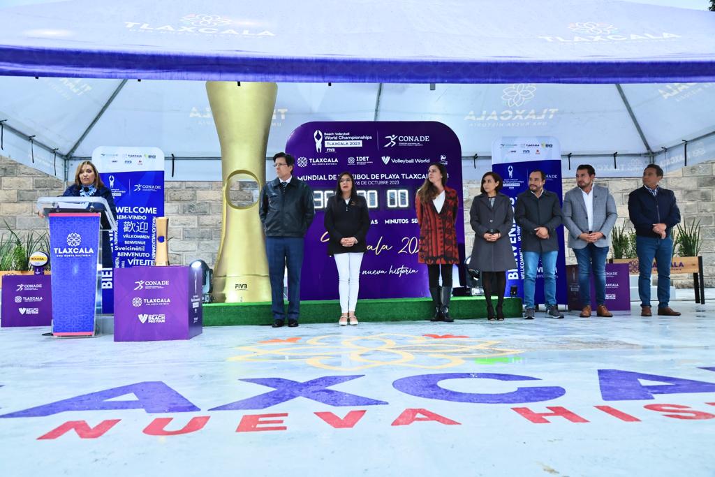 La gobernadora Lorena Cuéllar Cisneros, la directora general de la Comisión Nacional de Cultura Física y Deporte (Conade), Ana Gabriela Guevara Espinoza y el presidente de la Federación Mexicana de Voleibol (FMVB), Jesús Perales Navarro, activaron el reloj que marca la cuenta regresiva a un año del Campeonato Mundial de Voleibol de Playa Tlaxcala 2023.