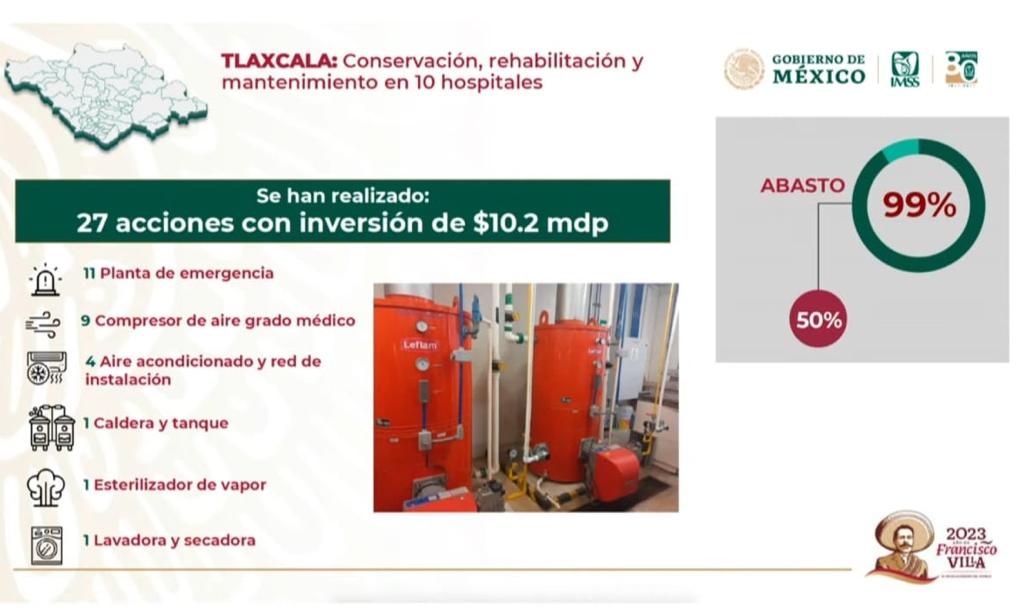 El director general del Instituto Mexicano del Seguro Social (IMSS), Zoé Robledo Aburto informó que durante el segundo semestre de 2022 y el primero de 2023, en Tlaxcala se invirtieron 10.2 millones de pesos en 27 acciones de conservación, rehabilitación y mantenimiento de 10 hospitales que opera el sistema IMSS–Bienestar.