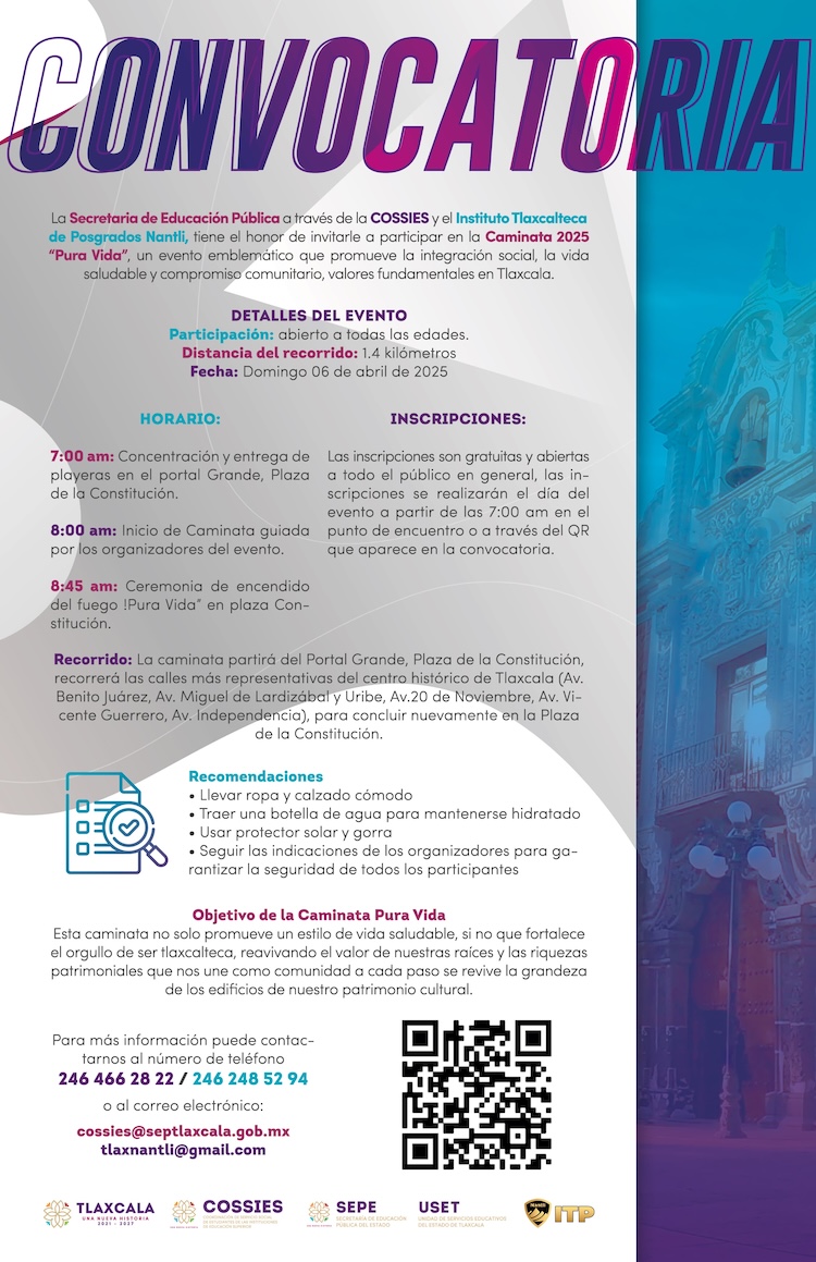 La Secretaría de Educación Pública a través de la Coordinación de Servicios Social de Instituciones de Educación Superior (Cossies) y el Instituto Tlaxcalteca de Posgrados Nantli, invitan a participar en la primer Caminata 2025 “Pura Vida”, un evento emblemático que promueve la integración social, la vida saludable, compromiso comunitario y apreciación de la rica cultura de nuestros edificios históricos, valores fundamentales en Tlaxcala.