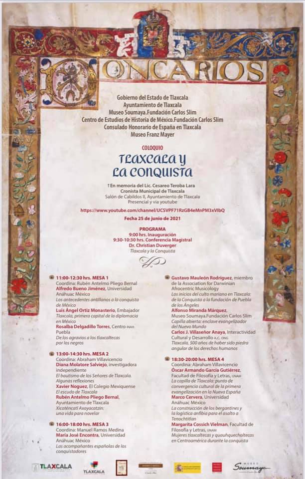 El ayuntamiento de Tlaxcala invita a los ciudadanos al próximo coloquio «Tlaxcala y la Conquista», en memoria a Cesareo Teroba Lara, cronista de la capital y expresidente de la misma, los organizadores; el Ayuntamiento capitalino en coordinación con el Gobierno del Estado de Tlaxcala, Museo Soumaya. Fundación Carlos Slim, Centro de Estudios de Historia de México. Fundación Carlos Slim, Consulado Honorario de España en Tlaxcala y Museo Franz Mayer.