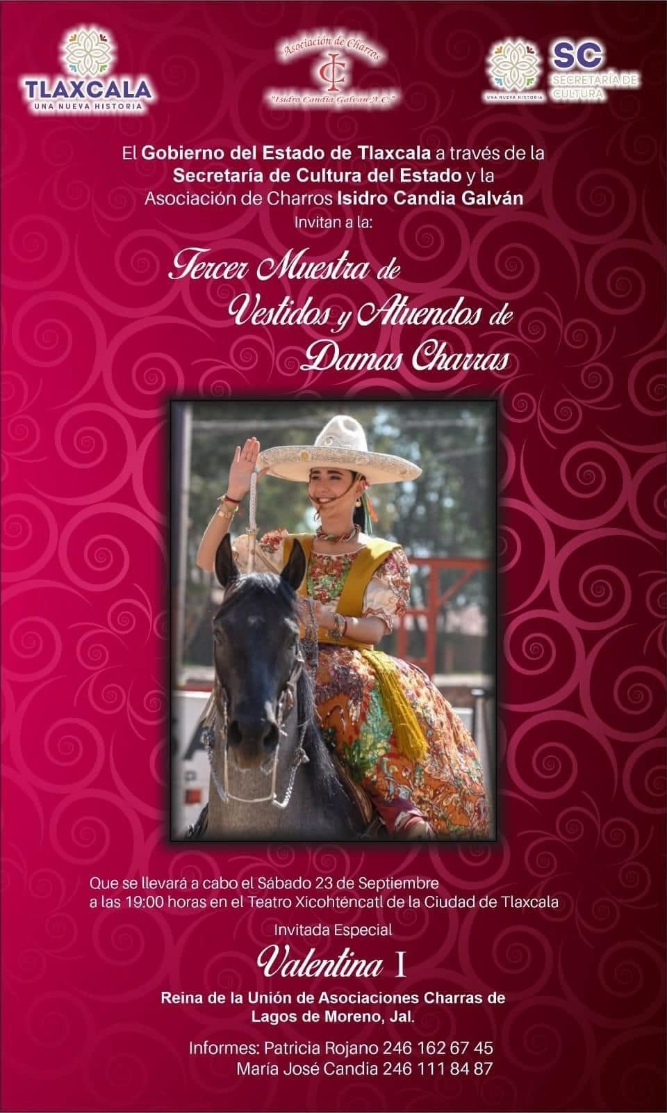 El gobierno del estado, a través de la Secretaría de Cultura (SC), en coordinación con la Asociación de Charros “Isidro Candia Galván”, invita a la tercera muestra de Vestidos y Atuendos de Damas Charras, que se llevará a cabo el próximo 23 de septiembre a las 19:00 horas en el Teatro Xicohténcatl de la capital.
