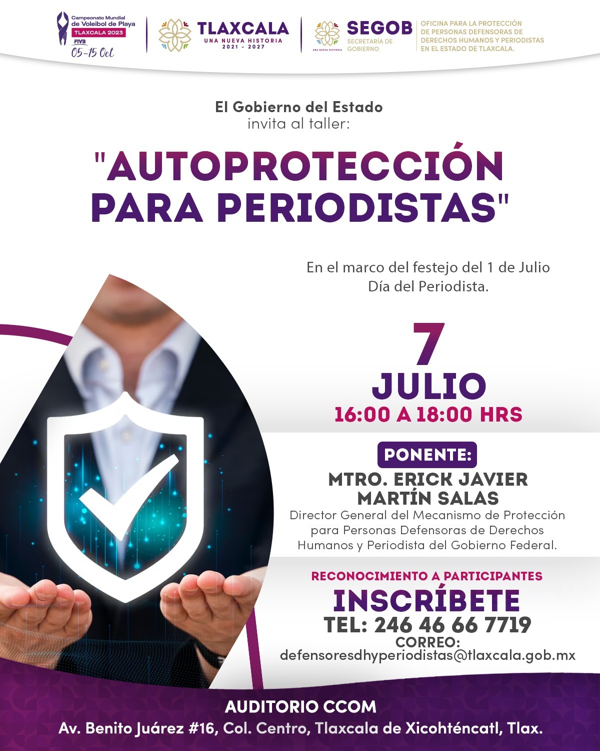 La Oficina para la Protección de Personas Defensoras de Derechos Humanos y Periodistas en el Estado de Tlaxcala, adscrita a la Secretaría de Gobierno (Segob), invita a los representantes de medios de comunicación a participar en el taller “Autoprotección para Periodistas”, que se llevará a cabo el próximo 7 de julio en el marco de la celebración del Día del Periodista.