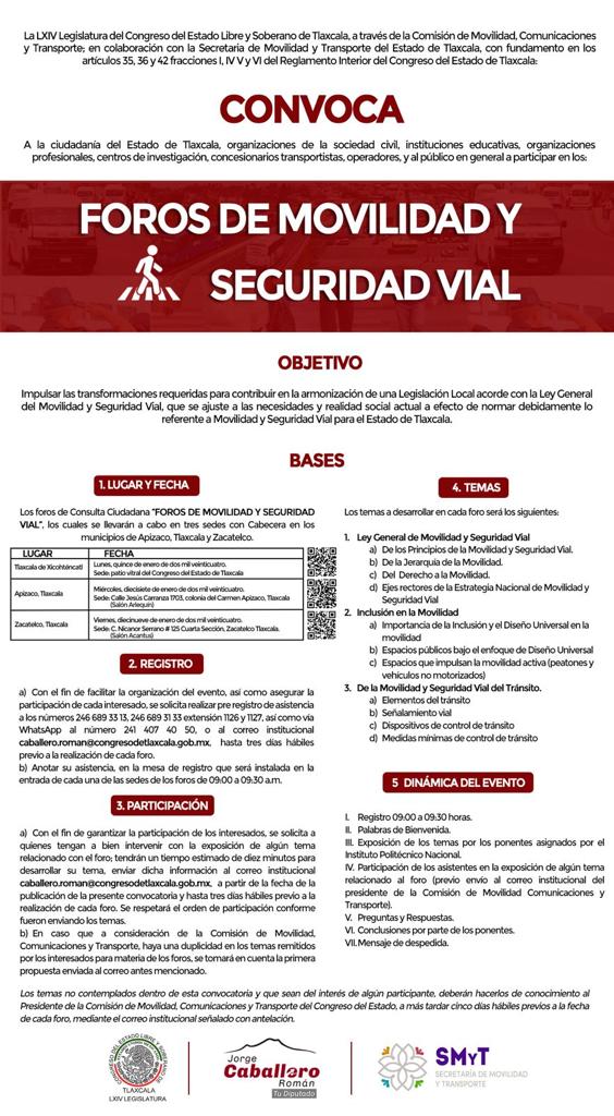 Los foros de consulta ciudadana denominados “Foros de Movilidad y Seguridad Vial” se llevarán a cabo en tres sedes, en los municipios de Tlaxcala, en el patio vitral del Congreso del Estado; así como en el salón Arlequín del municipio de Apizaco; y finalmente en el salón Acantus del municipio de Zacatelco, iniciando los trabajos a las 9:00 horas los días 17 y 19 de enero de 2024, respectivamente.