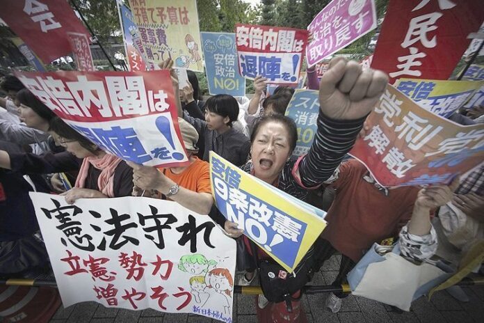 Cuando la coalición liderada por el Partido Demócrata Liberal chocó contra la legislación en la Dieta, en 2015, la opinión pública se dividió bruscamente, con los opositores superando en número a los partidarios en una encuesta realizada inmediatamente después de su promulgación. Pero los miembros del entonces partido opositor no. 1, el Partido Demócrata de Japón que lideró la campaña contra la legislación, se dividieron al entrar a la actual carrera electoral por la Cámara Baja -con los arribistas al Kibo no To (Partido de la Esperanza), del gobernador de Tokio Yuriko Koike, después de que el sucesor del Partido Demócrata, DPJ, se desbandó efectivamente, retrocediendo su posición al comprometer un apoyo calificado a la legislación. Varios otros partidos, incluido el otro grupo escindido de DP, el Partido Constitucional Democrático de Japón, mantienen su oposición.