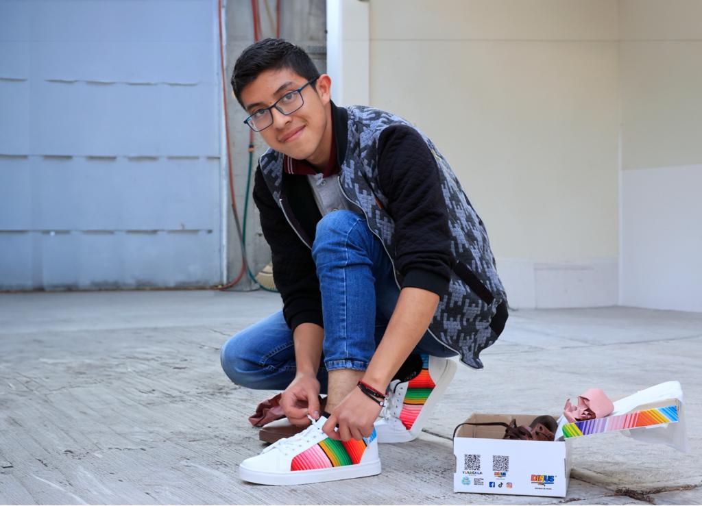 Nervioso, orgulloso y emocionado, Ricardo Hernández Xochitemol habló sobre su proyecto “Dinus Siempre de moda”, que es una microempresa que elabora tenis con diseños donde se resalta el arte de Tlaxcala, principalmente de su municipio de origen que es Contla de Juan Cuamatzi, pues su producto estrella es el calzado hecho con sarape.