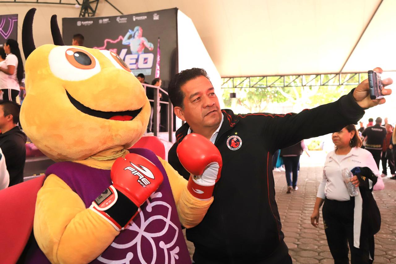 La sesión fue dirigida por la boxeadora profesional Rosa Olvera, en el Domo Blanco del Recinto Ferial, donde los asistentes realizaron ejercicios de sombra y rutinas de coordinación al ritmo de la música, a fin de fortalecer sus movimientos de destreza, agilidad y de autoprotección.