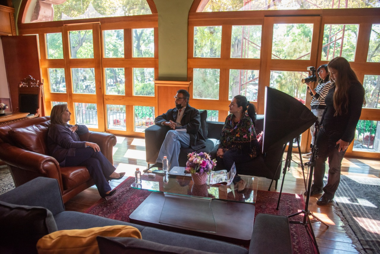 Araceli nos condujo hasta la oficina de Lorena Cuéllar Cisneros. Traspuesto el pórtico antiquísimo ascendimos por una escalera de piedra recubierta al centro con una alfombrilla roja. La oficina está casi completamente revestida de magnífica madera. De los muros cuelgan sendos retratos de La Corregidora, Morelos y Benito Juárez, más un paisaje de La Malinche pintado recién en 2021.