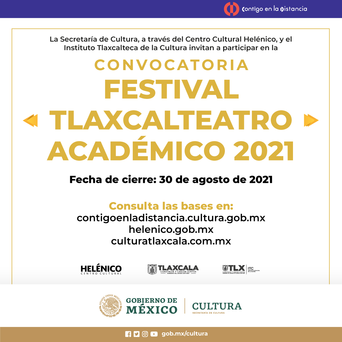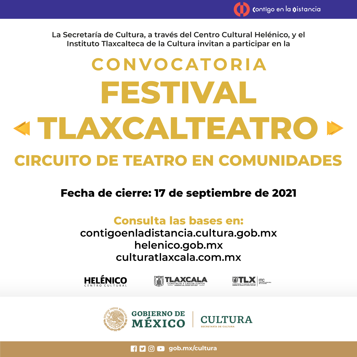 Para consultar las convocatorias completas, se puede visitar la plataforma contigoenladistancia.cultura.gob.mx y las páginas: cultura.gob.mx, helenico.gob.mx y culturatlaxcala.com.mx, así como en las redes sociales del Centro Cultural Helénico y del Instituto Tlaxcalteca de la Cultura. En estos mismos sitios web, se darán a conocer los resultados de cada convocatoria en las fechas antes señaladas.