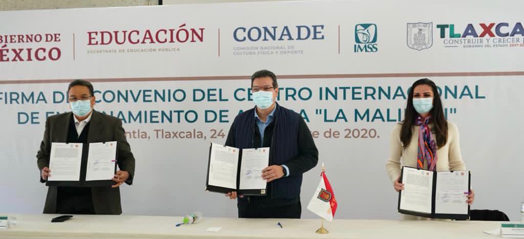 El gobernador Marco Mena firmó este martes con Ana Gabriela Guevara y Javier Guerrero García, respectivos titular de la Comisión Nacional de Deporte (Conade) y secretario nacional del IMSS, un convenio para la implementación del Centro Internacional de Entrenamiento de Altura «La Malintzi» en Tlaxcala, con la finalidad de reactivar el Centro Vacacional IMSS en la entidad.