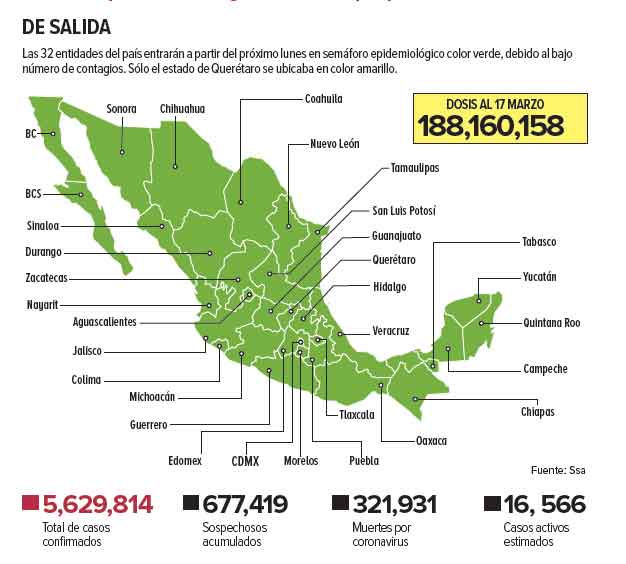 Por primera vez desde que se estableció, en junio de 2020, el semáforo covid-19 tendrá a los 32 estados del país en color verde, el nivel mínimo de riesgo epidémico.
