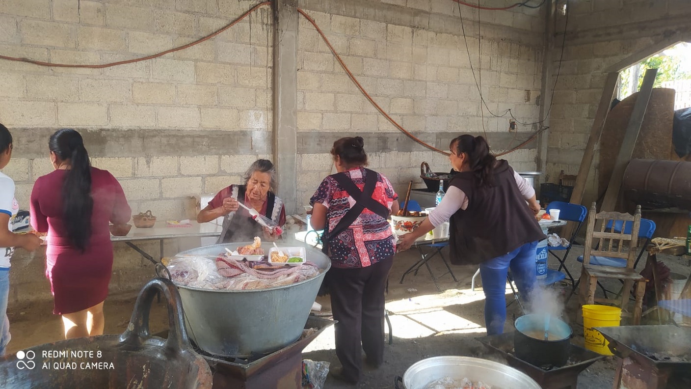 Completado el rito de renovación del cuerpo y la sangre de Cristo, la familia Rodríguez ofreció su mesa a los asistentes, agasajados a la manera tradicional con mixiotes de pollo, arroz rojo y refresco.