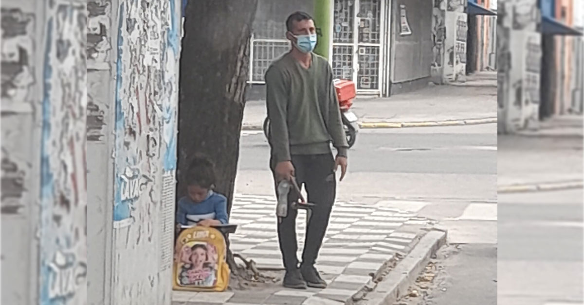 «Realmente no se como se llame, lo conozco porque todos los días al tomar esta ruta veo a este joven allí parado con su pequeña hija estudiando mientras espera paciente a su padre. Esa pequeña merece todas las oportunidades del mundo para poder surgir». Comentó Álvaro Romero en sus redes sociales.