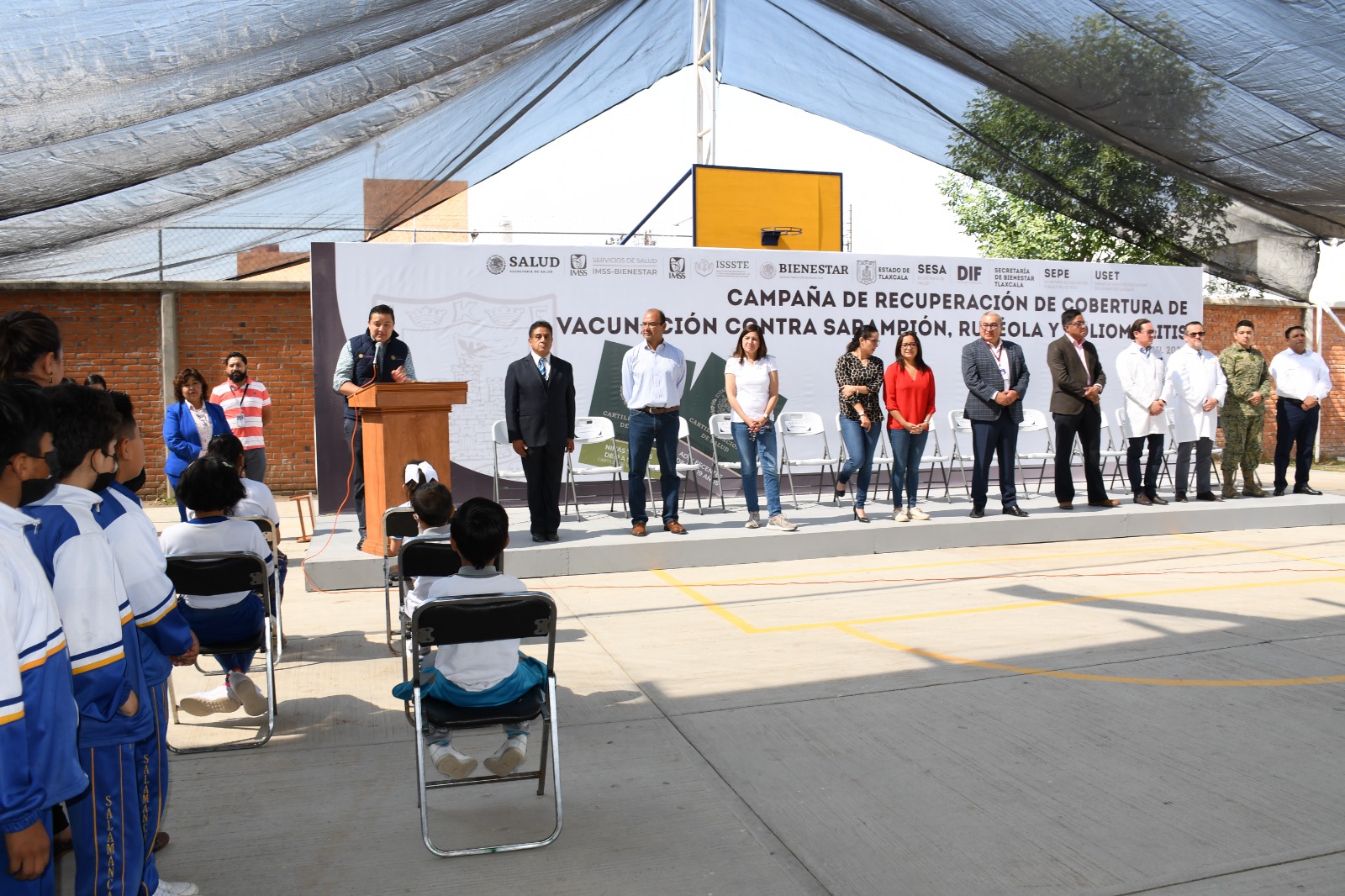 Con la finalidad de que infantes tlaxcaltecas cuenten con esquemas completos de vacunación contra sarampión, rubéola y poliomielitis, autoridades estatales realizaron la campaña de recuperación de cobertura de dosis en la escuela primaria Luis G. Salamanca, en el Municipio de Tlaxcala.