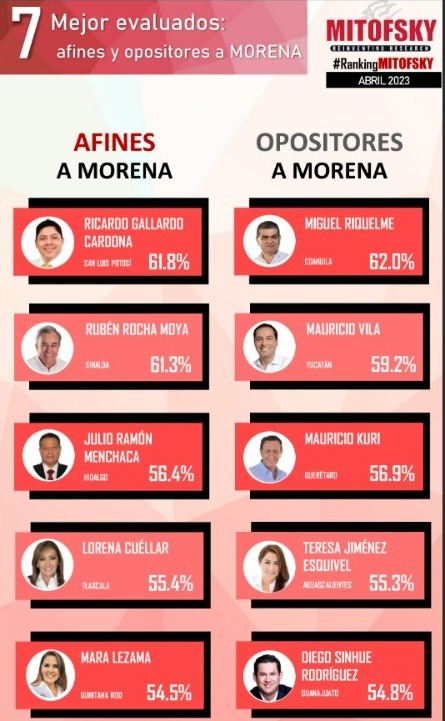 En el caso de gobernadores mejor evaluados, el gobernador de Coahuila Migue Riquelme encabeza la lista, con 62.0 por ciento, después de San Luis Potosí, Ricardo Gallardo Cardona con 61.8 por ciento, de Sinaloa, Rubén Rocha Moya con 61.3 por ciento, de Yucatán, Mauricio Vila con 59.2 por ciento y de Querétaro, Mauricio Kuri con 56.9 por ciento.