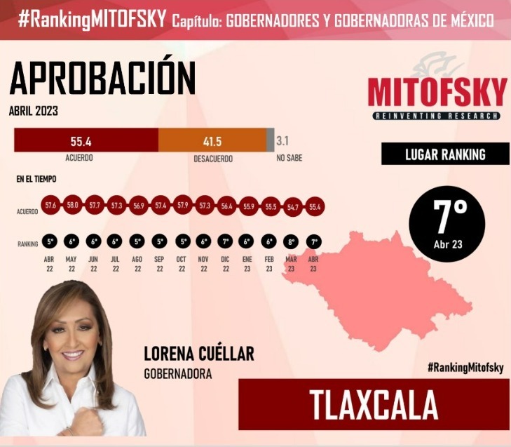 La mandataria local Lorena Cuéllar Cisneros se posicionó en el primer lugar como la mejor evaluada dentro del grupo de las cinco gobernadoras con mayor aceptación ciudadana en el Ranking de Consulta Mitofsky, correspondiente al mes de abril del 2023.