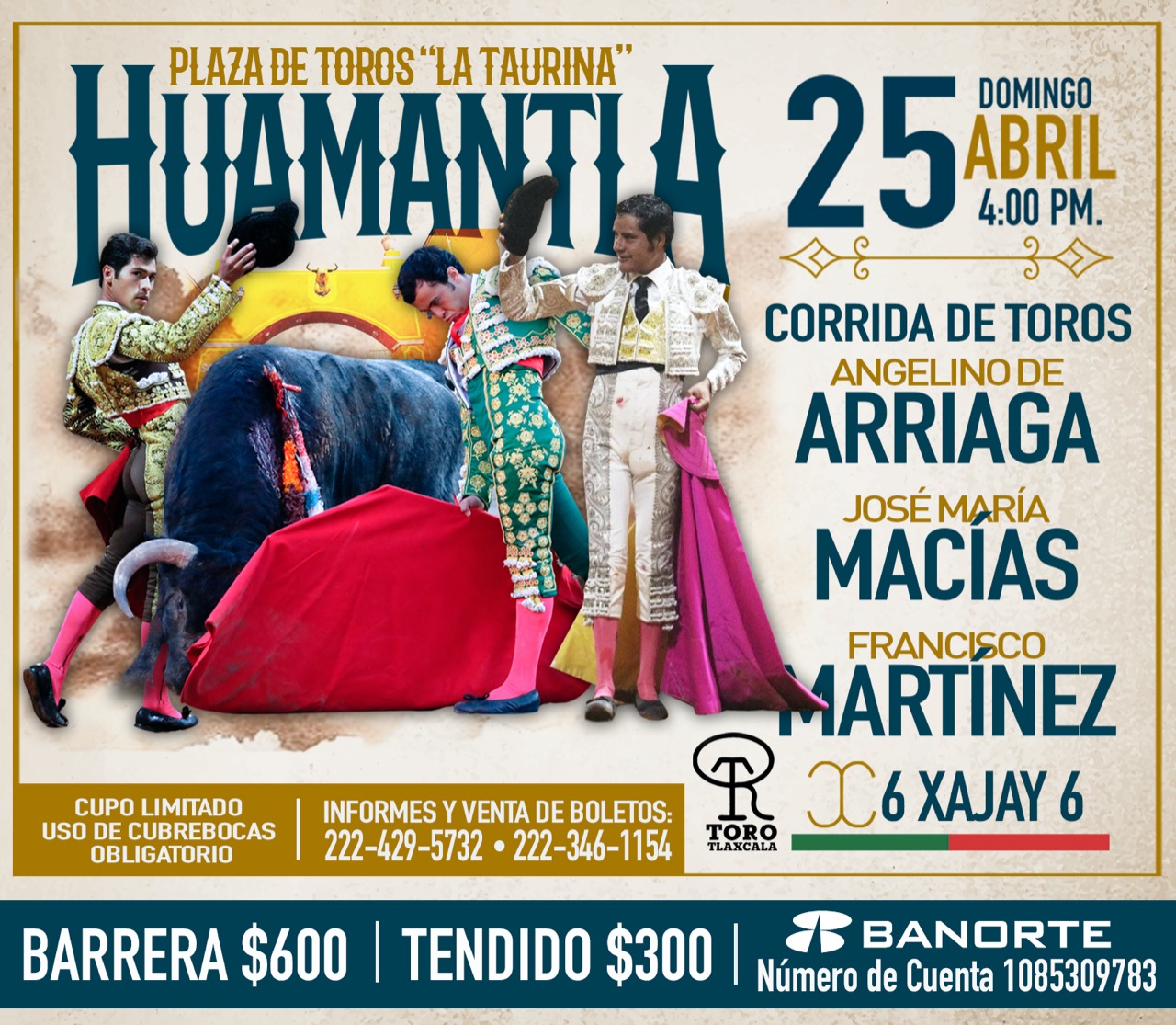 «Rifao» lamentó perder la oportunidad este domingo de torear la preciosa Corrida del prestigioso hierro queretano Xajay que le hacía mucha ilusión pero prefiere no arriesgar la recuperación, agradeció el apoyo del C. Gobernador, del Instituto de Desarrollo Taurino Tlaxcalteca, de las empresas, así como de su familia, amigos y aficionados.