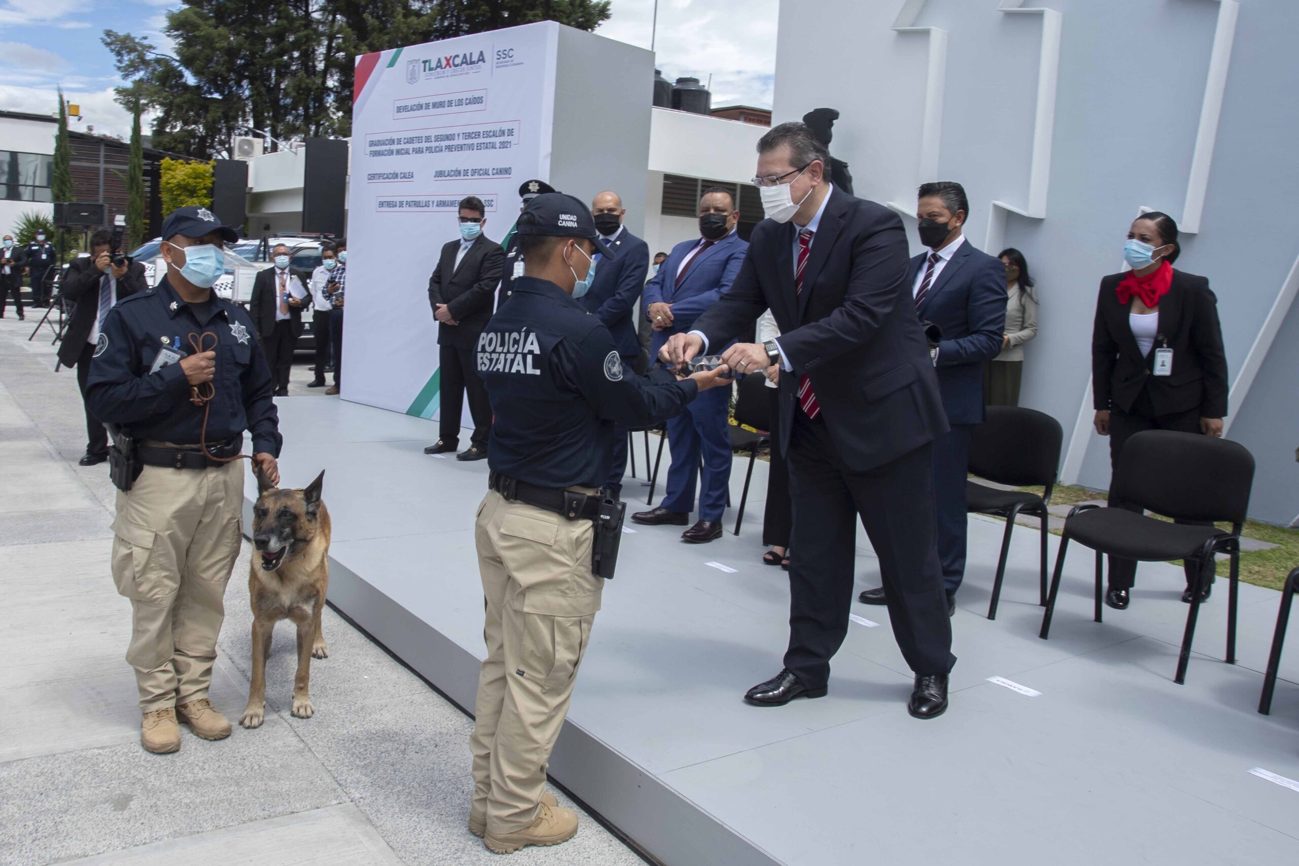 En el evento, el Gobernador Marco Mena atestiguó la jubilación del oficial canino «Hunter», tras 10 años de servicio en los cuales se desempeñó en la detección de narcóticos, armas y cartuchos.
