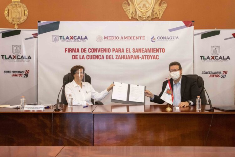 El Gobernador Marco Mena y la Directora General de la Comisión Nacional del Agua (Conagua), Blanca Jiménez Cisneros, firmaron el convenio de coordinación interinstitucional para integrar el Programa de Saneamiento del río Zahuapan-Atoyac y sus afluentes.