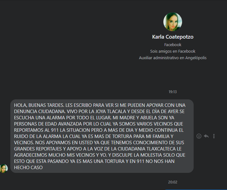 Desde ayer el molesto ruido de una alarma “tortura” al vecindario de una calle de la delegación La Joya de Tlaxcala capital, según denuncia enviada a través de Messenger desde la cuenta Facebook de Karla Coatepotzo.
