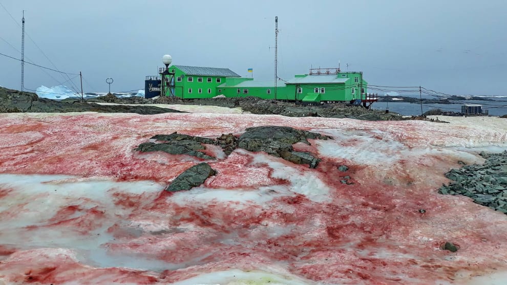 Las fotos tomadas por el biólogo ucraniano, Andriy Zotov, muestran a la Chlamydomonas Nivalis, una especie de alga capaz de “hibernar” durante el invierno y despertar cuando se producen las temperaturas más altas, como está ocurriendo ahora en el invierno de la Antártida.