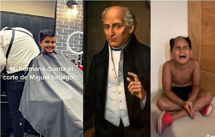 En el texto superpuesto en el video se lee: “Mi hermano quería el corte de Miguel Hidalgo…” y enseguida se ven las imágenes donde se ve al menor con el famoso corte del Padre de la Patria.