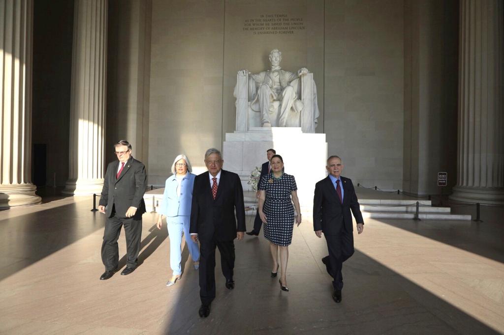 Tras visitar el monumento a Abraham Lincoln, el presidente Andrés Manuel López Obrador se trasladó a la estatua de Benito Juárez para rendir sus respectivos honores.