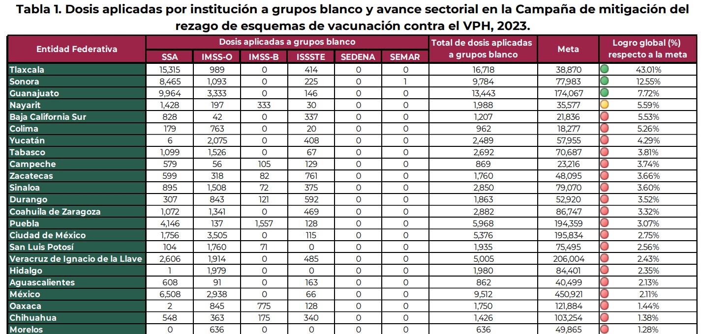 A nivel nacional, 103 mil 35 dosis de vacunas contra el VPH se han aplicado y en segundo lugar nacional se encuentra Guanajuato, seguido de Sonora, Estado de México, Puebla, Ciudad de México y Veracruz con 13 mil 443, 9 mil 784, 9 mil 512, 5 mil 968, 5 mil 376 y 5 mil 5 dosis aplicadas, respectivamente.