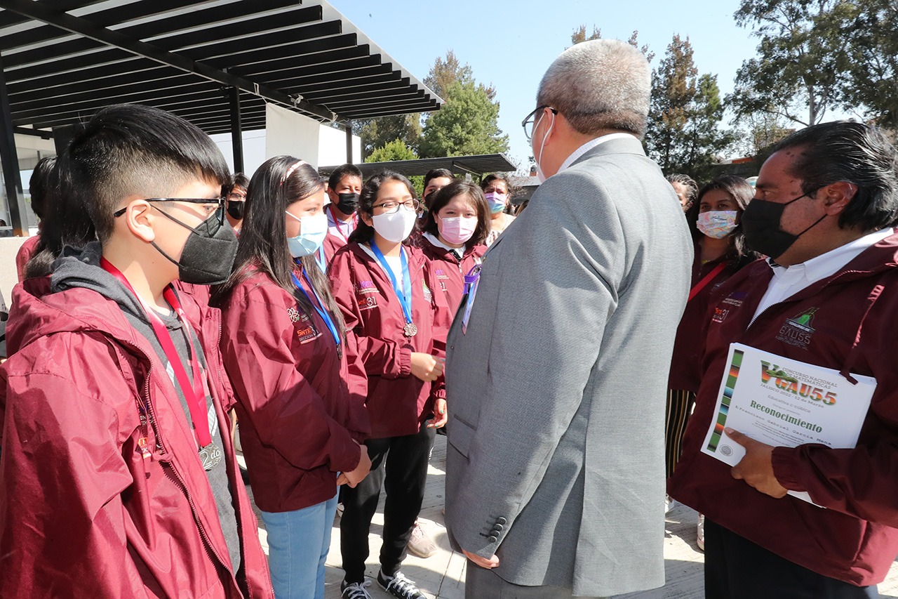 Al finalizar el homenaje, los alumnos se tomaron la fotografía oficial con el secretario de Educación y le platicaron su experiencia durante el concurso.
