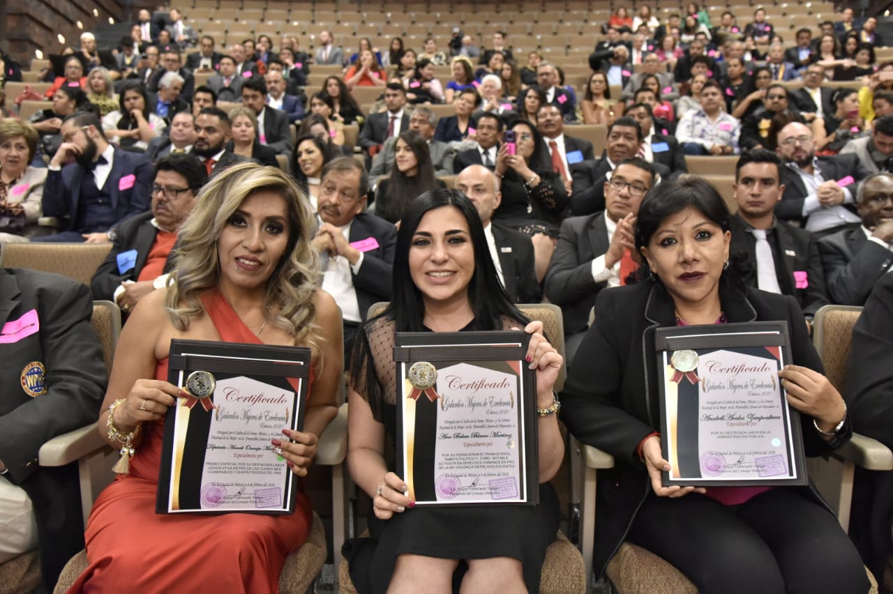El galardón fue entregado por el presidente fundador de la Cámara Nacional de la Mujer y presidente del Consejo Nacional de Cinematografía, Edgar Valenzuela Vargas, así como por la presidenta Ejecutiva de este organismo, Martha Mosqueda Penilla, quienes estuvieron acompañados de la diputada federal, Araceli Ocampo Manzanares, otra de las galardonadas.