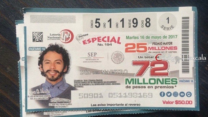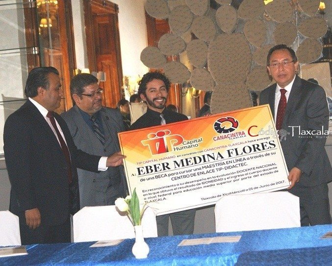 El ex periodista y docente Eber Medina Flores, un joven tlaxcalteca que se ganó a pulso el raro privilegio de aparecer en el billete de la Lotería Nacional correspondiente al sorteo celebrado el pasado 16 de mayo, Día del Maestro, fue reconocido por empresarios locales que le concedieron una beca para estudios de posgrado.