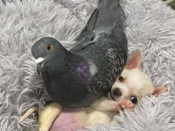Una paloma y un cachorrito de 8 semanas se conocieron en un albergue para animales con malformaciones o defectos de nacimiento.