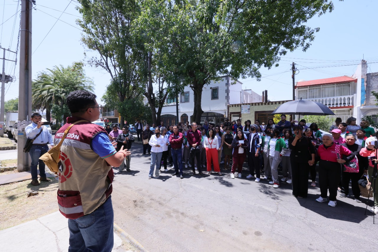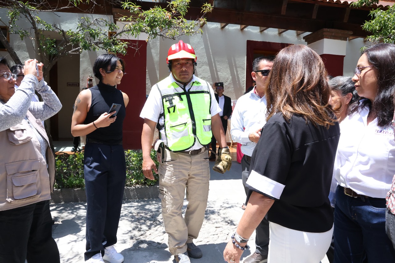 “Con el permiso de la palabra, gobernadora, presidente municipal, […] Recuerden, es muy importante tomar las siguientes indicaciones: no corro, no empujo, no grito y, sobre todo, siempre mantener la calma”, dijo el encargado de realizar el simulacro en ese punto.