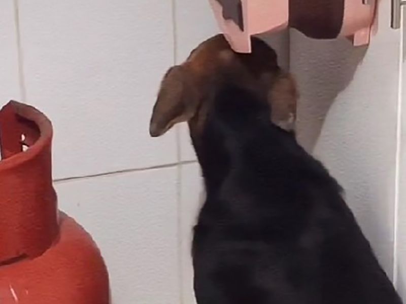 En las imágenes se puede ver al perrito temblando del miedo y en un rincón de la casa.