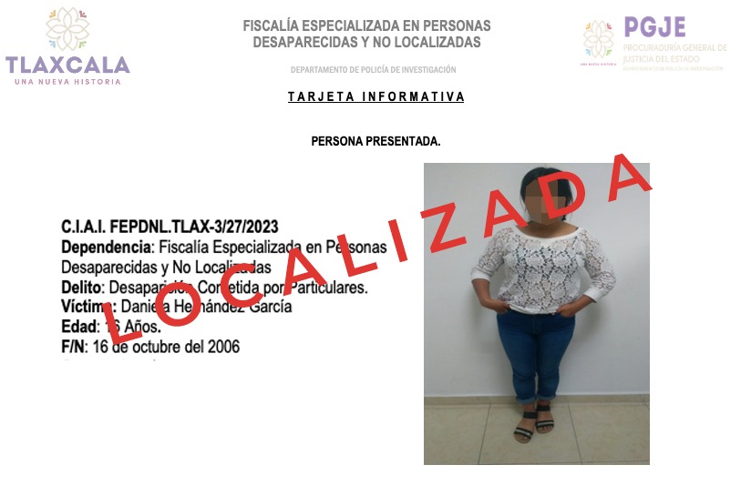 Agentes de la Policía de Investigación adscritos a la Fiscalía Especializada en Personas Desaparecidas y No Localizadas (Fepdnl), de la Procuraduría General de Justicia del Estado (PGJE), localizaron a una menor de edad reportada como desaparecida.