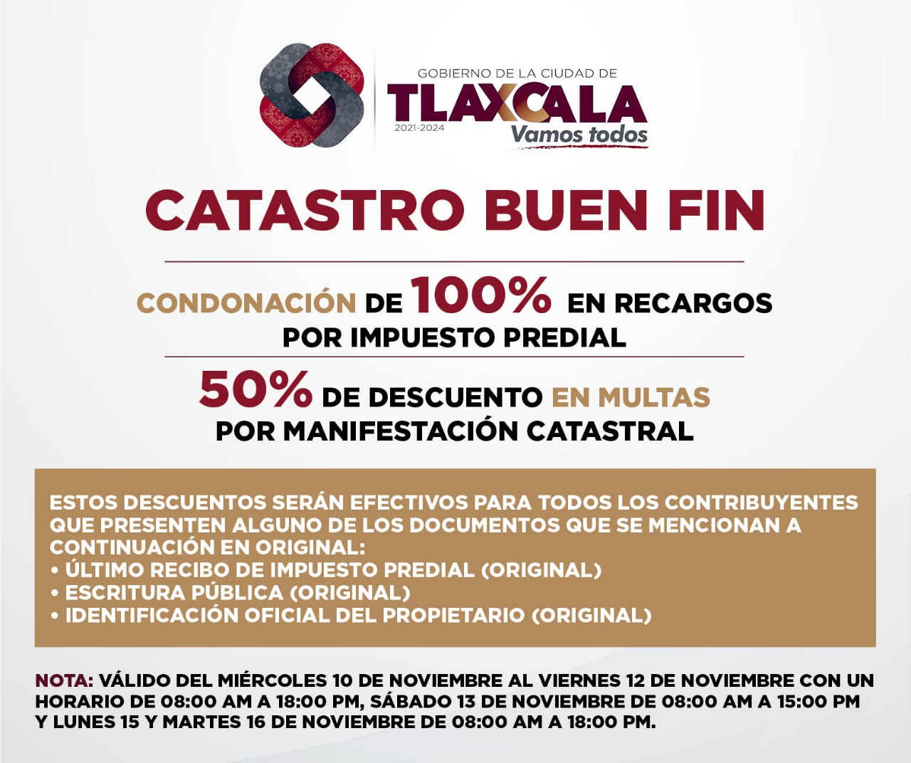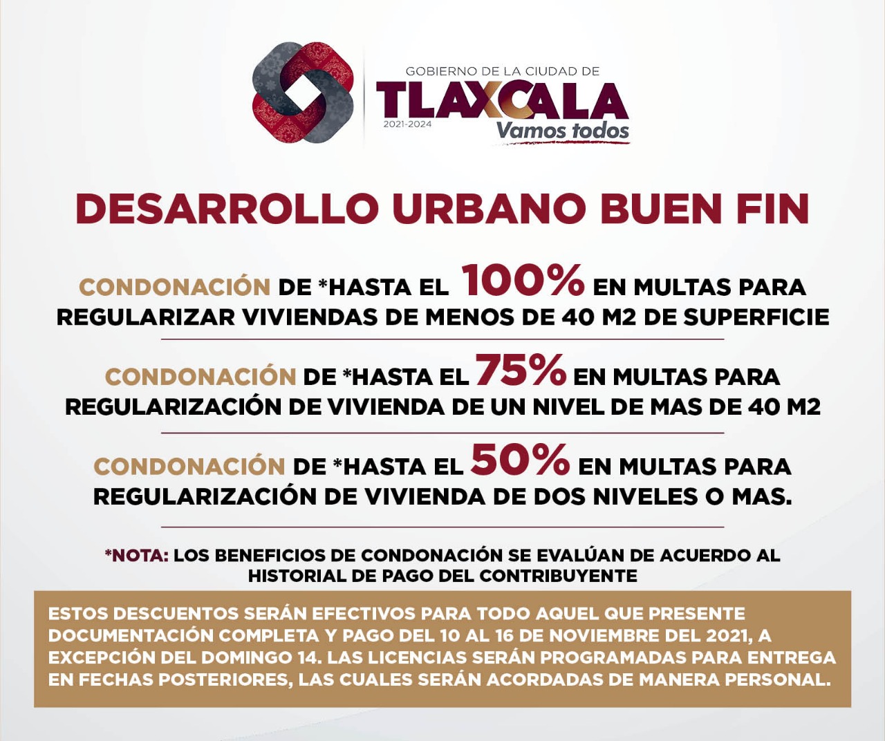 Las rebajas del catastro “serán efectivas para aquellos contribuyentes que presenten su último recibo de pago de impuesto predial (original), escrituración pública (original) e identificación oficial del propietario”. En tanto que los beneficios de condonación de multas del área de Desarrollo Urbano, “se evalúan de acuerdo al historial de pago del contribuyente y serán efectivos para todo aquel que presente documentación completa y pago del 10 al 16 de noviembre del 2021, a excepción del domingo 14”.