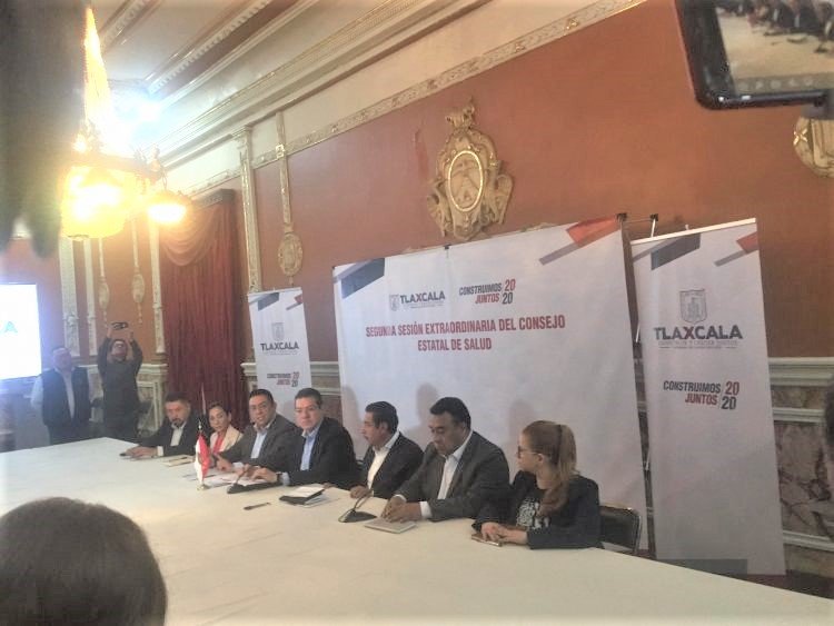 Marco Mena y sus colaboradores comparecieron ante los reporteros junto a una mampara con el lema Construimos Juntos 2020, y la frase Segunda Sesión Extraordinaria del Consejo Estatal de Salud, en un ambiente de incertidumbre por la propagación del coronavirus COVID-19. El virus se ha esparcido en el lapso de tres meses y medio desde el infectado cero en Wuhan, China, por más de 120 países donde ha cobrado a la fecha unas seis mil muertes, principalmente personas mayores de 50 años.