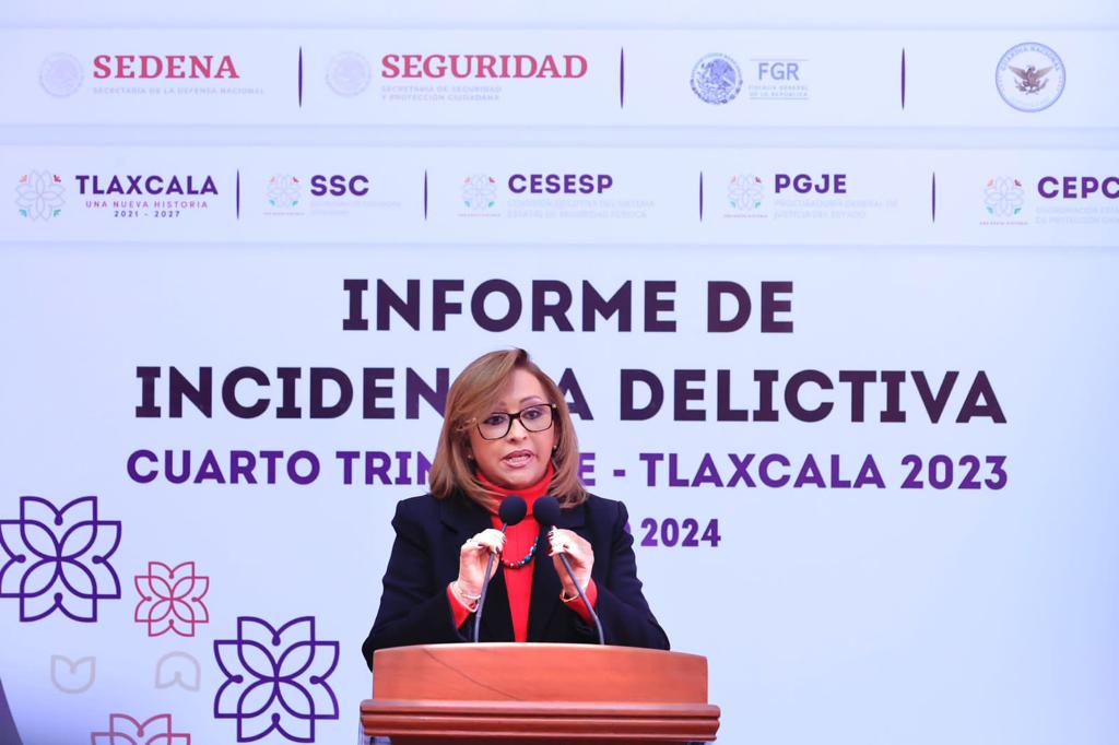 La gobernadora Lorena Cuéllar Cisneros encabezó la presentación del Cuarto Informe Trimestral de Incidencia Delictiva 2023, en el que se dio a conocer que Tlaxcala ha ocupado por 17 meses en lo que va de la administración el primer lugar a nivel nacional como la entidad más segura, al registrar la menor incidencia delictiva del país.