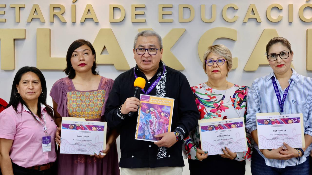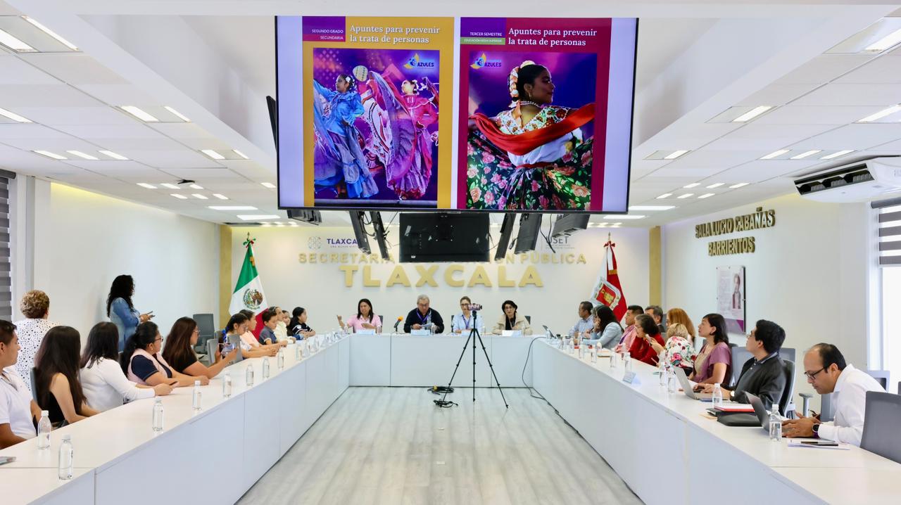 Autoridades de la Secretaría de Educación Pública del Estado y de la Unidad de Servicios Educativos del Estado de Tlaxcala (SEPE-USET) presentaron el prototipo del Libro de Texto “Apuntes para prevenir y erradicar la trata de personas con fines de explotación sexual en niñas y mujeres”, el cual está dirigido a alumnos de segundo grado de secundaria y tercer semestre de educación media superior.