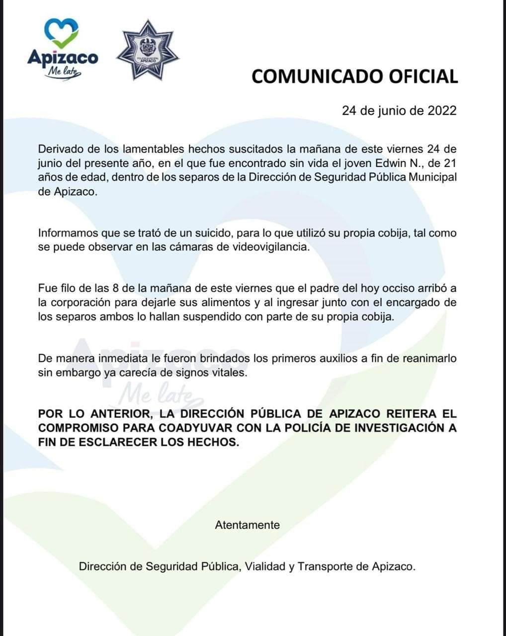 Un comunicado emitido este día por la Dirección de Seguridad Pública de Apizaco, informa que se trató de un suicidio, “para lo que utilizó su propia cobija, tal como se puede observar en las cámaras de videovigilancia”, aseguran.