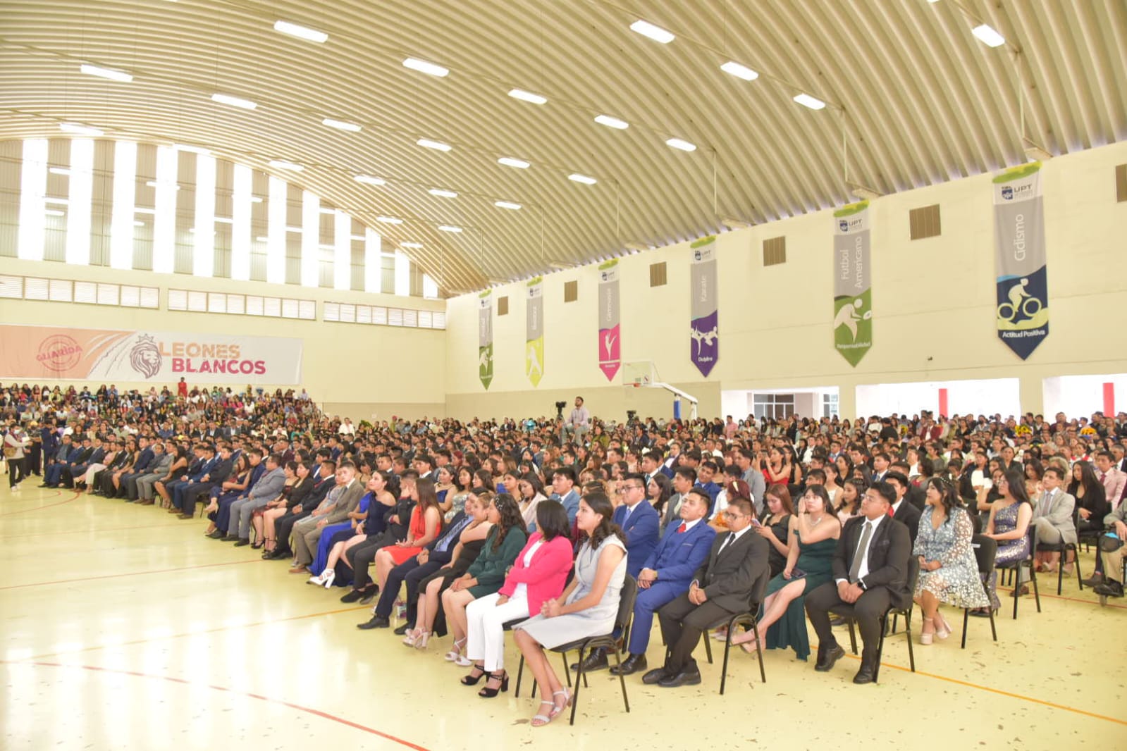 El gimnasio de la UPTx fue el escenario donde se entregaron los títulos a 101 graduados de Ingeniería Financiera, 102 de Tecnologías de la Información y 31 de Sistemas Automotrices.