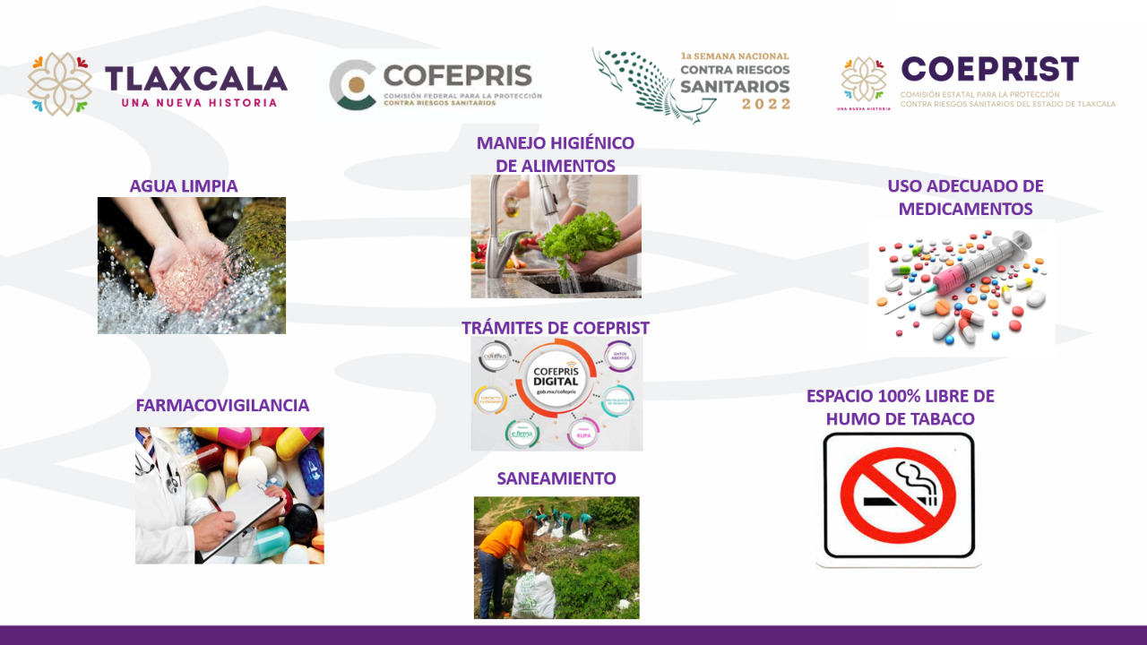 La Comisión Estatal para la Protección contra Riesgos Sanitarios del Estado de Tlaxcala (Coeprist) llevará a cabo la Primera Semana Nacional de Protección contra Riesgos Sanitarios “Juntos por la salud”, del 02 al 09 de mayo en 15 municipios, la cual es una estrategia para intensificar las acciones de prevención y fomento sanitario.
