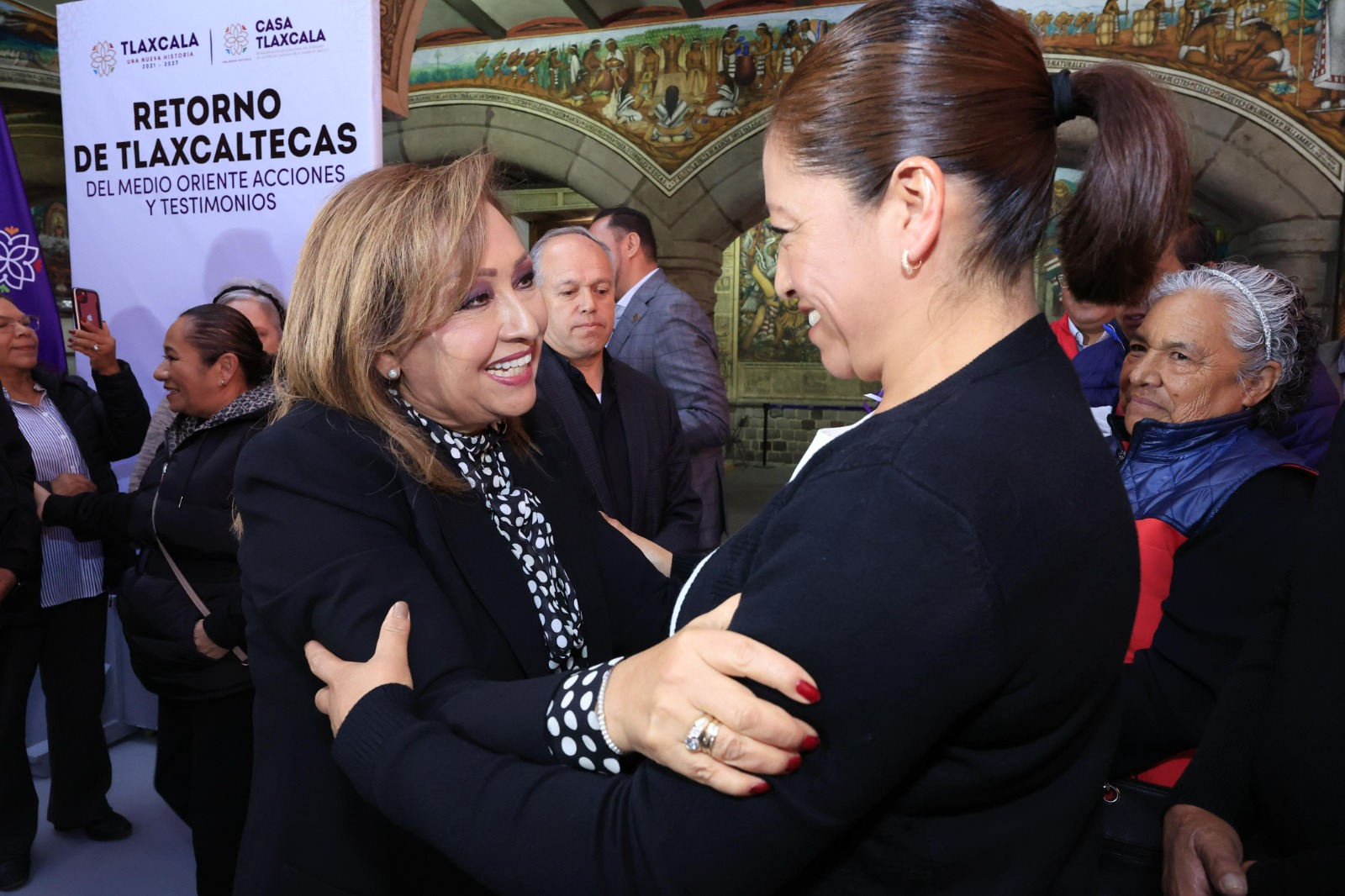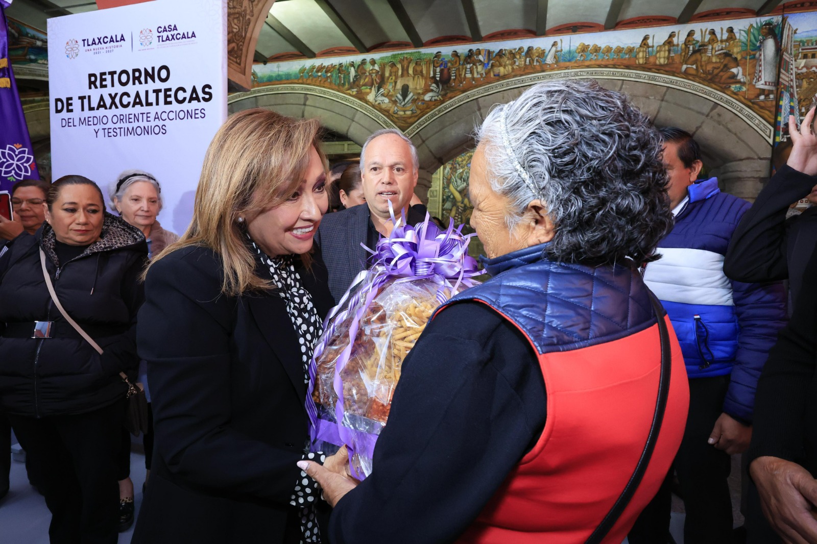 La titular del Ejecutivo local, Lorena Cuéllar Cisneros, acompañada del representante Delegacional, Promotor de Inversiones Extranjeras y Enlace Internacional de Casa Tlaxcala en Ciudad de México, Luis Vargas González, dio la bienvenida a los 22 connacionales tlaxcaltecas que retornaron a la entidad tras ser rescatados del conflicto armado entre Israel y Palestina.