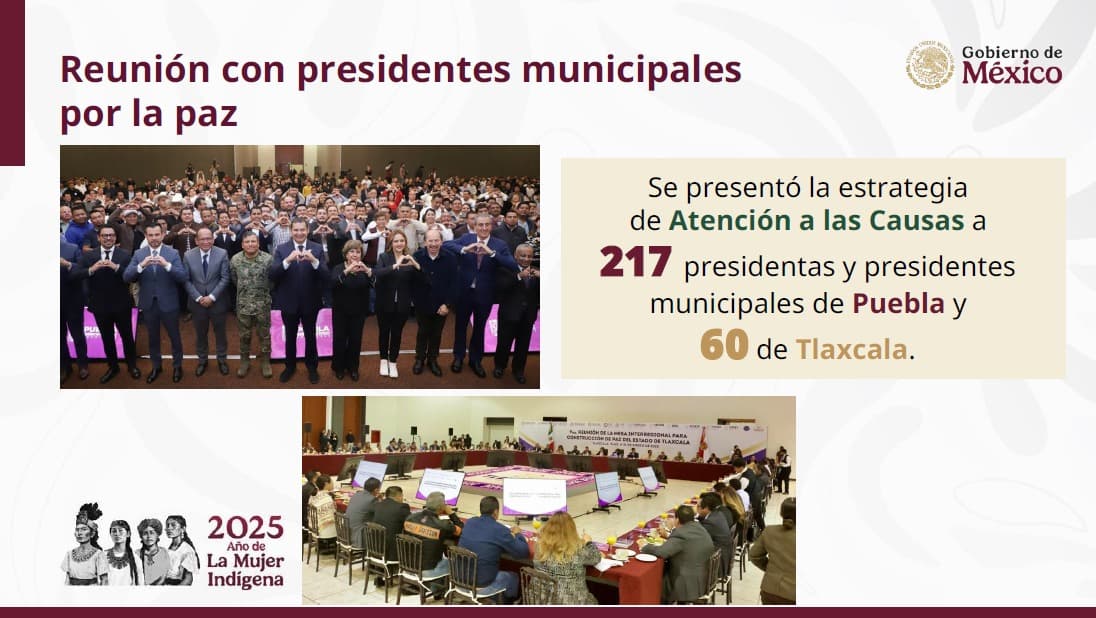 Tras señalar que la construcción de paz también depende del compromiso de los municipios, la funcionaria federal indicó que, como parte de las reuniones con presidentes municipales, se presentó la estrategia de Atención a las Causas a 217 alcaldes de Puebla y 60 de Tlaxcala, a fin de impulsar la conformación de los comités de paz municipales.