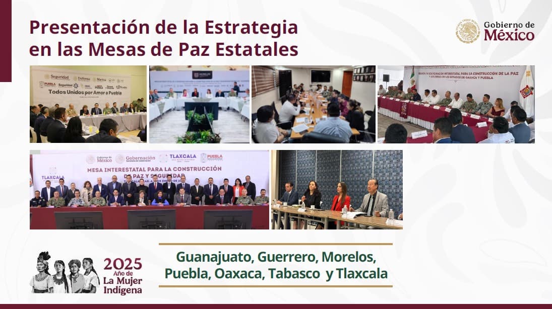 En su oportunidad, en el marco de la Estratega de Atención a las Causas de las Violencias en México, Rosa Icela Rodríguez, titular de la Secretaría de Gobernación (Segob), destacó el desarrollo de las Mesas Estatales de Paz en Guanajuato, Guerrero, Morelos, Puebla, Oaxaca, Tabasco y Tlaxcala, donde gobernadoras y gobernadores la aplican con eficacia.