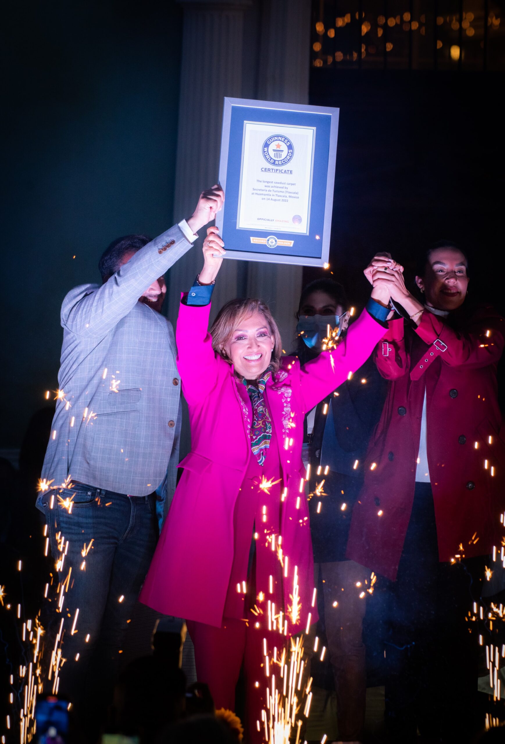 En tanto, los adjudicadores oficiales de Guinness World Records, Susana Reyes y Alfredo Arista, certificaron que la alfombra de Huamantla cumplió con los requisitos establecidos y alcanzó 3 mil 932.6 metros de largo.