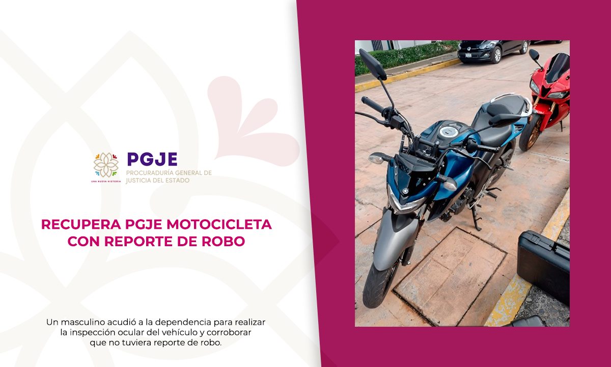 De acuerdo con los hechos, un masculino llevó su motocicleta a las instalaciones de la PGJE, a fin de que se le realizara la inspección ocular del vehículo, ya que la había adquirido y quería corroborar que no contara con reporte de robo, por lo que elementos de investigación procedieron a realizar la revisión de los numerales, los cuales, no presentaron alguna alteración.