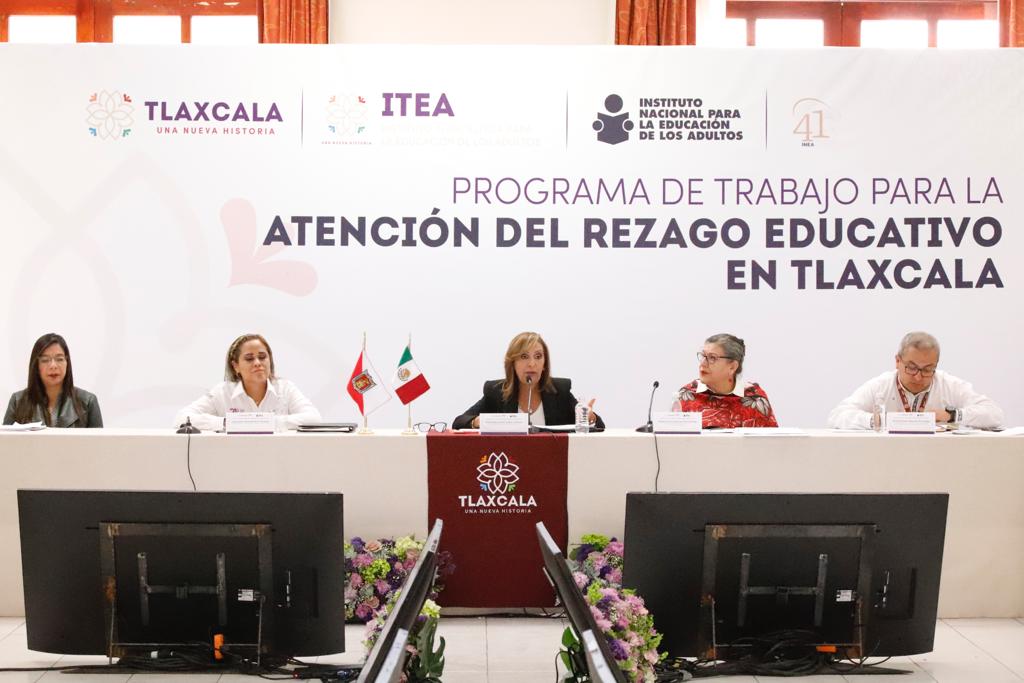 La gobernadora Lorena Cuéllar Cisneros presidió la reunión “Programa de trabajo para la atención del rezago educativo en Tlaxcala”, organizada por el Instituto Tlaxcalteca para la Educación de los Adultos (ITEA), en conjunto con el Instituto Nacional para la Educación de los Adultos (INEA), con el objetivo de impulsar acciones conjuntas que permitan avanzar en este eje primordial.